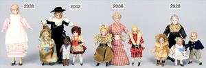 3 Teile Puppenstuben-Puppen, Dame, 14,5 cm, Biskuitbrustblatt-Kopf, -Arme und -Beine, Stoffkörper, 2 Puppenstuben- Kinder