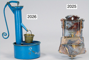 Konv. Puppenküchenteile, Wand-Kaffeemühle, 13,5 cm, 2 x 3-teiliges Waschset im Orig.-Kart., 2 Teile blau emailliert, dazu 1 Gewichtesatz
