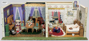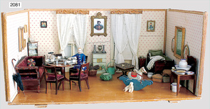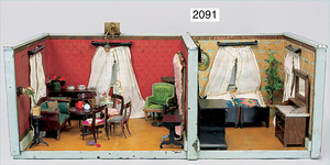 2-teilige Puppenstube, wohl vor 1900, 73 cm, 4 Fenster, Durchgang, alte Tapete an Wand und Boden, möbliert, schöne alte Sitzgruppe, Fehler an den Holzteilen sowie Bezug verschlissen, Wohn- und Schlafzimmermöbel