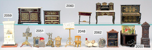 Puppenstuben-Möbel, BOULLE Sekretär, mit Marmorplatte, 10,5 cm breit, Kommode mit 3 Schubladen, Aufsatzkommode mit Marmorplatte, Aufsatz fehlt, 12,5 cm, kl. Nähtisch, 1 Fuß fehlt, Klavier, 10 cm breit, ohne Klappe über den Tasten