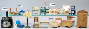 Puppenstuben-Ausschmückungsteile, 2 Betten, Blech, 20/30er Jahre, 14,5 cm und 11,5 cm, 1 Puppenbett, Holz, kl. Blech-Waschtisch, Stuhl
