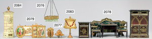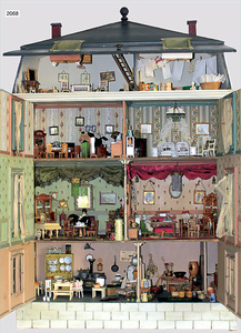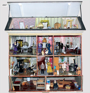 museales gr. außergew. Puppenhaus, ca. 1880, 180 cm hoch, 125 cm breit, 46 cm tief, Fassade zum Öffnen, vorne und seitlich Fenster, Dach mit Fenstern, 6 Zimmer, Vorratskammer, sowie 2 Zimmer unter dem Dach, alte Bemalung außen, Orig.-Bemalung innen und außen, obere Zimmer Tapete neuer, möbliert, reichh. Zubehör, Teile Messingblech vergoldet, Porzellanteile, Glasteile, Blech- und Keramikteile, Küche mit Herd und viel Zubehör, 4 Puppenstuben-Puppen, sehr dekorativ, einige Artikel auf der Abbildung werden separat versteigert, z.B. u. a. 2084, 2076, 2079