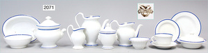 Kaffee- und Speiseservice, Keramik, teils signiert Villeroy & Boch, blau/weiß, 2 Kannen, Milchkanne, 6 Tassen, Teller, Suppenschüssel, Schalen, Sauciere, 2 Henkel weggebrochen, 1 Spitze einer Kanne Weggebrochen, sonst guter Zust.