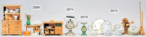 Puppenküchen-Möbelprogrammteile, Schrank, 21 cm, Kommode, Bank, einige Holzteile, Porzellanserviceteile, für Puppenküche um 1900