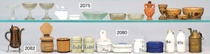 Puppenküchen-Ausschmückungsteile, 6 Teile Pressglas, einige Holzschalen, 1 Senftopf, Porzellan, 3,8 cm