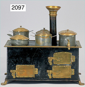 Puppenstuben-Herd, 29 cm, um 1900, Löwentatzenfüße, Messingtüren, Messingfassung, 3 Töpfe, Pfanne, Wasserschiff, Weißblech handgelötet, Messingdeckel, für Küche mittlerer Gr.
