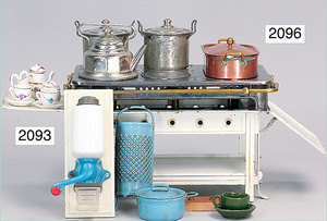 Spiritus betriebener Puppenküchenherd, mit Aufstelltischen seitl., 28 cm breit, 20 cm hoch, Wasserschiff, 2 Töpfe, Wasserkessel, ca. 1920, mit Brenner