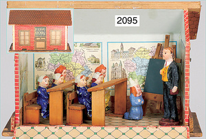 FRANKREICH Schule, 30 cm breit, 19,5 cm hoch, außen lithogr.., Papier, seitlich angedeutete Fenster, 2 Schulbänke, 6 Masse-Schüler, Tafel, Lehrer, schöner Orig., Zustand, ca.1910