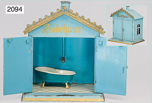Uralt, Badehaus, Blech handlackiert, mit goldenen Zierlinien, 2 Fenster, 2 Türen, Schornstein, kl. altersbed. Lackabplatzer am Sockel und Dach, Höhe 24,5 cm, guter Orig.-Zust.