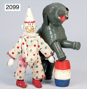 SCHÖNHUT Humpty-Dumpty, kleine Serie, Elefant, 18 cm, Rüsselspitze fehlt, Clown, 19 cm, stärker bespielt, dazu 1 Holzfass