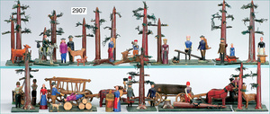 ERZGEBIRGE Holzschlag, Figuren, 6,5 cm, mit angedeuteter Nase, Stammwagen von 2 Pferden gezogen, Leiterwagen von 2 Kühen gezogen, 8 Bäume, viele Figuren, Baumstücke, Baumstämme, Männer bei der arbeit, Aufseher zu Pferd, Waldtiere museal, Zeitzeugnis, über die Herstellung, über des Spielzeugs im Erzgebirge