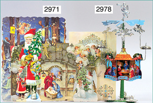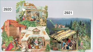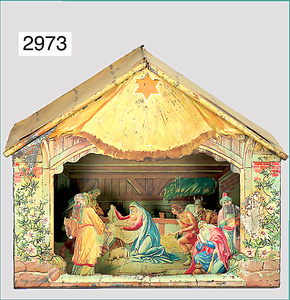 3 Teile Aufstellkrippen, Glanzbild, 22,5 cm - 29 cm hoch, 2 x guter Zust., 1 x obere Decke eingerissen
