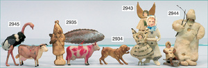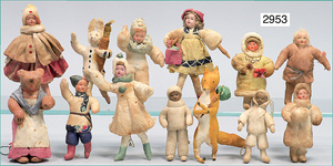Weihnachtsschmuck, Wattefiguren, Russland, 20er Jahre, 13 Teile, außergew. Darstellungen, Kinder, Tiere, 9,5 cm - 11 cm, ausgefallen