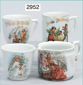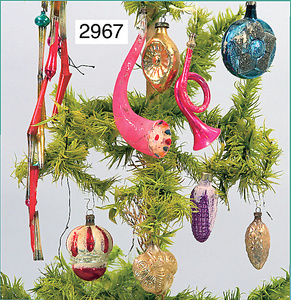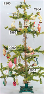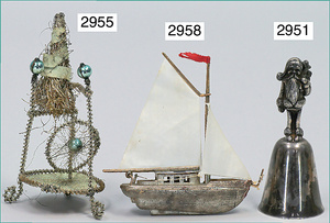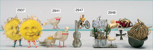 4 Teile Christbaumschmuck, 1 x Sepnitz, Brunnen mit Storch, 1 Taube, Watte, mit eisernem Kreuz, 1 Candycontainer in Helmform, 3 kl. Watte-Karotten