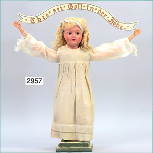 Weihnachtsengel, 62 cm, Celluloid-Brustblattkopf, braune fest eingesetzte Glasaugen, off. Mund, Holzkörper, Holzarme, mit Schild "Ehre sei Gott in der Höhe"