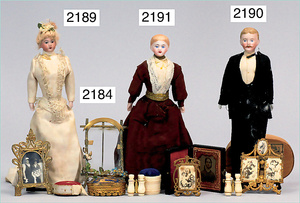 Puppenstuben-Puppe-Dame, 17 cm, Biskuit-Brustblattkopf, -Arme und -Beine, Stoffkörper, Orig.-Kleidung und -Unterkleidung, feine Bemalung, außergew. Frisur
