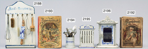 Puppenküchen-Ausschmückungsteile, Blech emailliert, Topflappenhalter, Zwiebelhalter, Löffelhalter, Wandhalter mit Krug, 1 Teller, Durchm. 6 cm, sehr guter Zust.