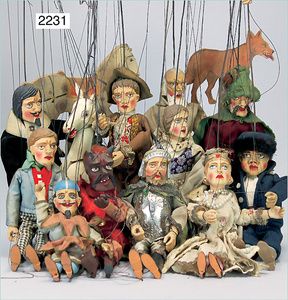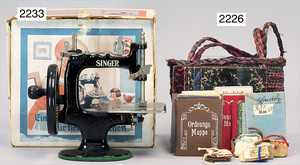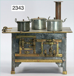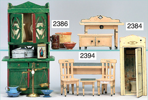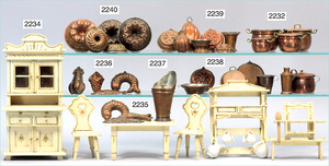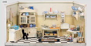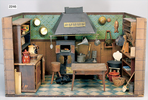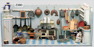 Puppenstuben-Küche, ca. 1910, 97 cm breit, 54 cm hoch, möbliert, mit Herd, reichh. Zubehör, Porzellanteile, Weißblechteile, einige Teile Blech emailliert, Zinnteile, Orig.-Tapete an Wand und Boden, teilw. Verschlissen, 1 Teil der Frontverzierung ergänzt