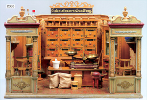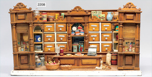 Kaufladen, Gründerzeit, 79 cm breit, 45 cm hoch, Schubladen mit Porzellanschildern, mit alter Tapete ein mal neu tapeziert, reichh. Zubehör, Dosen, Flaschen, Pappschachteln, Orig.-Außenbemalung