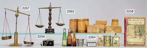 Puppenküchen-Ausschmückungsteile, Blech lithogr., Tellerwaage, 8,5 cm, 2 Brotdosen, Wischtuchhalter, dazu 1 kl. Kupferkessel