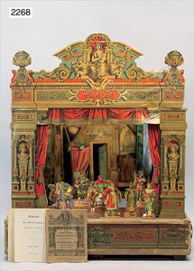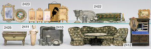kl. Franz. Reise-Puppenstube, 41 cm breit, 21 cm,5 cm hoch, 22 cm tief, möbliert, Orig.-Tapeten an Wand und Boden, ein wenig verschmutzt, mit Zubehör, unberührter Orig.-Zust.