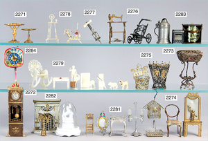 Konv. Puppenstuben-Ausschmückungsteile, Tisch, Bilder, mit Messingblech vergoldeten Rahmen, kl. Dose, Messingblech vergoldet, 2 Ferngläser Bein, Spanschachtel mit Teelichtern, Kleinteile