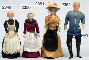 BIEDERMEIER Puppenstube-Puppe, 12,5 cm, Biskuit-Brustblattkopf, blonde ausmodellierte Haare, blaue gemalte Augen, Stoffkörper, Biskuit-Arme u. -Beine, flache Füße, Orig.-Kleidung u. -Unterkleidung