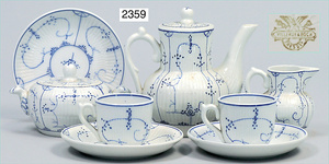 Konv. Puppenküchenteile, Porzellan, Salz- und Mehlmetze, aus untersch. Programm, 1 x mit Deckel, 6,5 cm, Salz, Pfeffer und Seife, Speiseserviceteile, Teller Durchm. 6 cm, 6 Tassen mit Untertasse, Dekor rot/gold