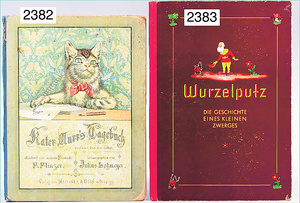 2 Teile Bücher, Nr. 1 "Möpschen hat Zahnschmerzen", Bilder von Helmut Skarbina, 1928, Hundegeschichten, Nr. 2 "lustige Geschichten aus der Kinderwelt", von E. Elias, schöne Lithogr., ein paar Seiten beschädigt, früh