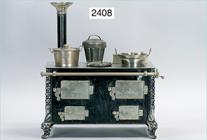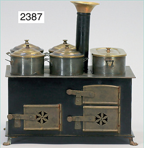 kl. Puppenküchenherd, Weiß, Türen vernickelt, mit Topfsatz, Wasserschiff, Wasserkessel, Topfpfanne, 2 Töpfe, mit Brenner und Schornstein, 22 cm, schöne Form, schöne Gr., für mittelgr. Küche