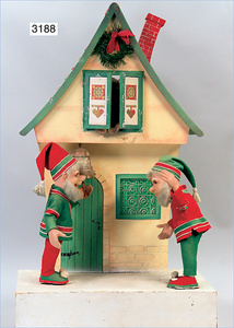 4 Teile Christbaumschmuck, 1 x Sepnitz, Brunnen mit Storch, 1 Taube, Watte, mit eisernem Kreuz, 1 Candycontainer in Helmform, 3 kl. Watte-Karotten