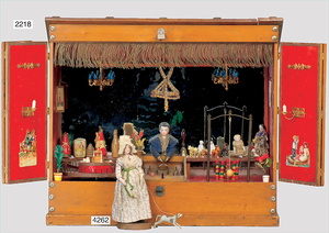 Puppentasche, 11,5 cm, gefüllt mit Kämmen, Bürsten, Spiegel, Parfumfläschchen, kl. Notizkalender, Kruzifix, Schrank, Messing/Blech vergoldet