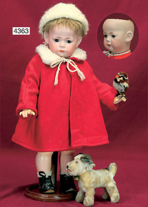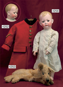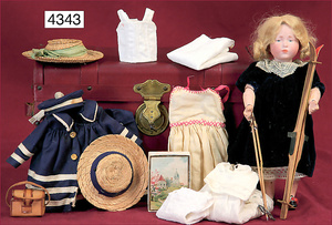 ERNST HEUBACH gemarkt Hufeisen-Symbol Hch 2 H, 48 cm Biskuit-Brustblattkopf, blaue Schlafaugen, off. Mund, oben Zähne, Kinngrübchen, Lederkörper mit Porzellan-Armen, Kleidung neuer, Perücke neuer