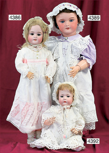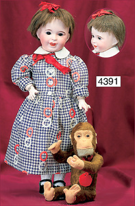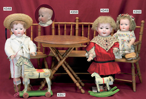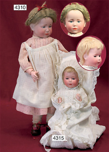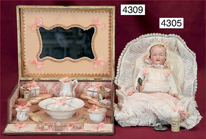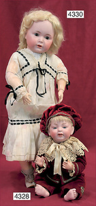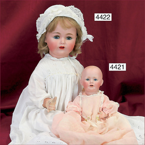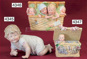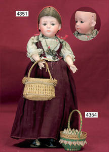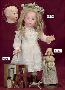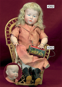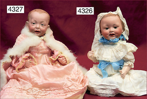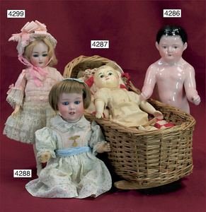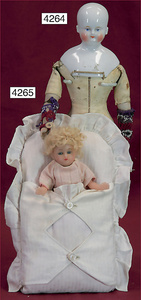 Biskuit-Porzellan-Charakterpuppe, Vollkopf, 159-1 1/2, 25 cm, Kurbelkopf, blaue gemalte Augen, off./geschl. Mund, Kinngrübchen, ausgeformter Sitzbabykörper, mit untersch. Handhaltung, leicht abstehender Zeh, alte Kleidung