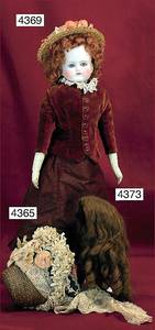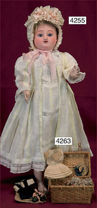 K&R Simon & Halbig, Biskuitporzellankopf-Puppe, 65 cm, braune Schlafaugen, off. Mund, oben Zähne, Gliederkörper, Körper wohl Kestner, Farbabweichungen an den Händen, 1 Finger fehlt, alte Echthaarperücke, alte Kleidung, Unterkleidung, Schuhe und Strümpfe