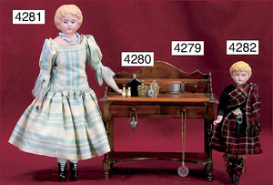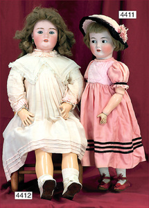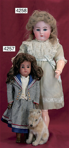 SIMON & HALBIG 1299, Biskuitporzellankopf-Puppe, 49 cm, Kurbelkopf, ein wenig Perückenpull seitl., braune Schlafaugen, off. Mund, oben Zähne, Kinngrübchen, durchst. Ohren, Gliederkörper, Körper an einigen Stellen farbl. ausgebessert, alte Mohairperücke, Kleidung alt, alte Schuhe
