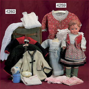 Trousseau-Koffer, 40 cm breit, mit einigen Kleidungsstücken, Mäntel, Unterwäsche, kl. Muff im Orig.-Kart., Muscheltasche für Puppe ca. 45 cm - 50 cm