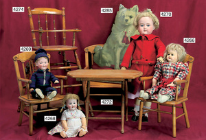 Puppen-Sitzgruppe, ca. 1910, Bank, 42 cm breit, Tisch, 38 cm, dazu 2 Stühle