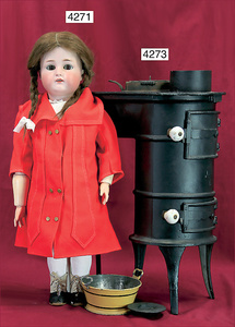 Gussofen, um 1900, 53 cm, mit Waffeleisen, sowie 1 Schüssel handlackiert, schöne Puppendeko.