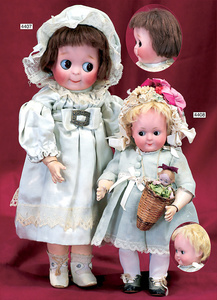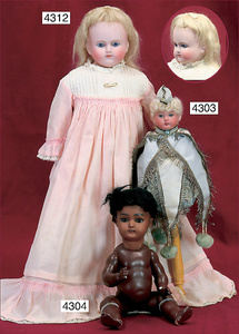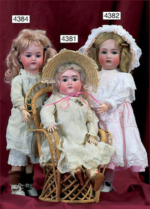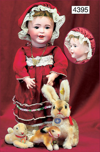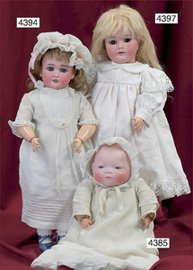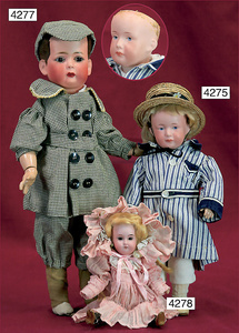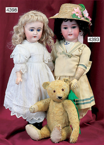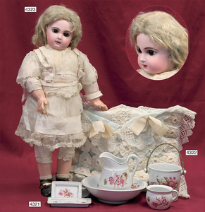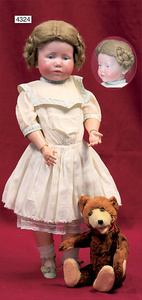 K&R 717, 70 cm, (117 N in Celluloid), blaue Schelmenaugen, off. Mund, oben Zähne, Kinngrübchen, Toddlerkörper mit hochgezogenen Kniegelenken, schöne volle alte Mohairperücke, alte Schuhe u. Strümpfe, sehr schöner Orig.-Zust.