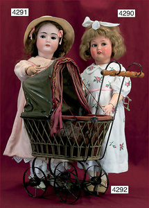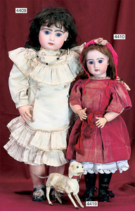 Biskuitporzellankopf-Puppe, gemarkt 109, Heinrich Handwerck, 86 cm, Kurbelkopf, braune Schlafaugen, off. Mund, oben Zähne, Kinngrübchen, durchst. Ohren, Gliederkörper, Körper teilw. Farbl. Überarbeitet, Perücke neuer