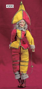 frühe Pappmaché-Puppe, 19 cm, Pappmaché-Brustblattkopf, Holzarme und -beine, Orig.-Kleidung, dazu 1 Masse-Hund