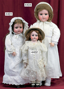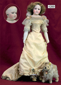 FRANZ SCHMITT & CO 54 cm, Biskuit-Kurbelkopf, braune Schlafaugen, off. Mund, oben Zähne, Kinngrübchen, durchst. Ohren, Chip an 1 Ohrloch, schöne Modellierung, Gliederkörper, Kleidung u. Perücke neuer