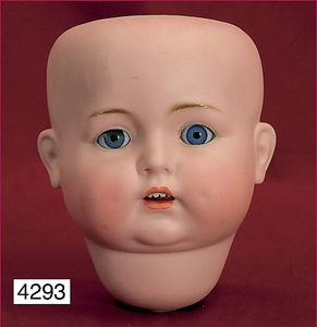 Biskuit-Porzellan-Charakterkopf, gemarkt A.W. darunter W., Kopfdurchm. 14 cm, Höhe Kopf 20 cm, für eine ca. 90 cm - 1 m Puppe, off. Mund, oben Zähne, Grübchen, Augenmechanismus liegt lose bei, 1 Auge lose, muss gerichtet werden
