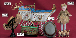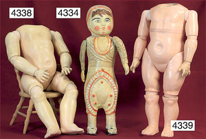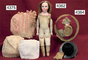 Konv. Puppenkleidung, untersch. Gr., Kleider, Röcke, Weißwäsche, dazu eine Echthaarperücke, ca. 20 Teile, um 1910, dazu 1 Wachstuchkörper, Arme Celluloid, Kopf Celluloid später (Ersatzteilspender)