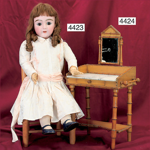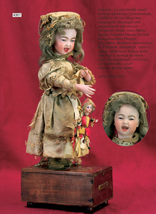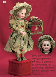Kitty Steiner Automat, 52 cm, Biskuitkopf, fest eingesetzte blaue Glasaugen, off. Mund, kl. Zähne, Puppe bewegt Arme und Beine und dreht dabei den Kopf, minim. Abplatzer am li. Augenlid, kaum sichtbar, Uhrwerk intakt