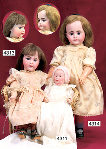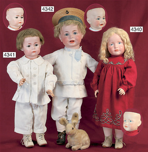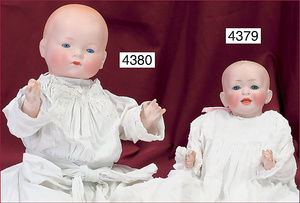 JDK Kestner, gemarkt 19, Hilder Typ, Biskuit-Vollkopf, blaue Schlafaugen, (Transportrisiko für Augenmechanismus beachten), off. Mund, oben Zähne, Sitzbabykörper mit untersch. Handhaltung, 35 cm, ein paar kl. Masse-Abplatzer am Hals, schöne Modellierung