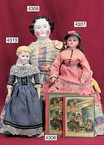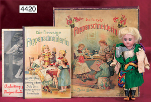 "Die fleißige Puppeschneiderin", von Julie Lutz, Anleitungsbuch, einige Schnittmuster, kl. Biskuit-Porzellankopf-Puppe, 19 cm, blaue Schlafaugen, off. Mund, alte Mohairperücke, Masse-Stehkörper, anmodellierte Schuhe und Strümpfe, dazu kl. Biskuitporzellankopf-Puppe, AM 1894