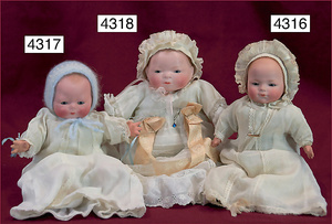 AM 341.14.K, 43 cm, Kurbelkopf, blaue Schlafaugen, geschl. Mund, ausgeformter Sitzbabykörper, altes Taufkleid, 2 Finger ausgebessert, bitte Transportrisiko für den Augenmechanismus beachten