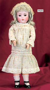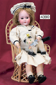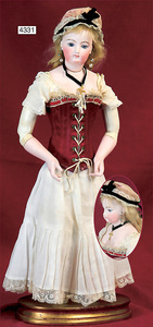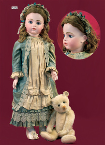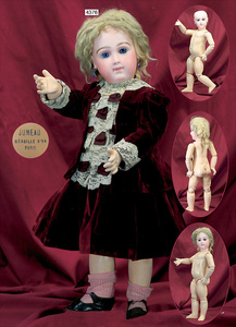JUMEAU frühe Emile-Jumeau, mit ungewöhnlich selten Ausdruck, gemarkt 12, 65 cm, gepresster Biskuit-Kurbelkopf, blaue fest eingesetzte Glasaugen, geschl. Mund, Kinngrübchen, angesetzte durchst. Ohren, Jumeau-Gliederkörper, mit festen Handgelenken, blauer Stempel im Rücken, Jumeau Medaille D.O.R Paris, alte Mohairperücke, Kleidung aus alten Stoffen genäht, Orig.-Schuhe, sehr ausdrucksstark